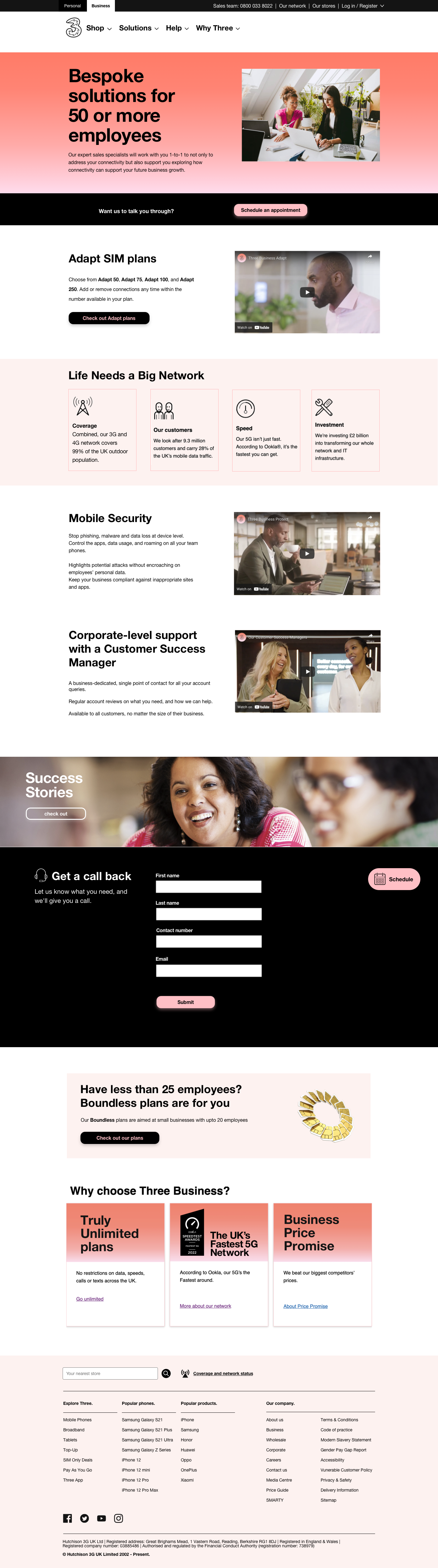 A marketing page targetting small and medium businesses sharing Three business solutions.